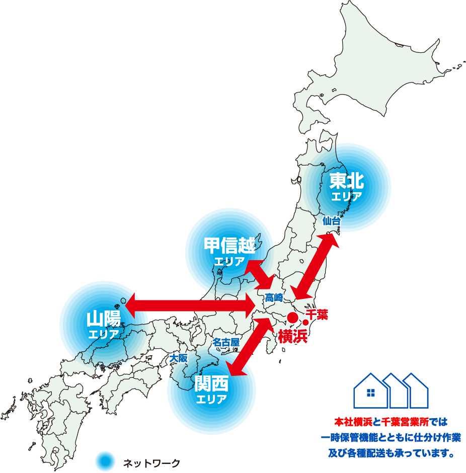 小倉運輸の配送ネットワークと物流拠点 ワンストップの物流サービスで安心と実績の全国輸送を実現 長距離配送のネットワーク 各地域の協力会社とパートナーシップを結び、東北、甲信越、関西、山陽エリアへの長距離輸送ネットワークも整備し、お客様の幅広いご要望にお応えしています。 例